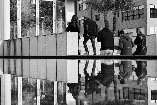 I saw this group from a distance, their forms interestingly (well to my eye) reflected in the water feature of their building. There were engrossed in their conversation, so it was easy to pre-focus the camera and get close enough to take the shot without drawing attention to myself.